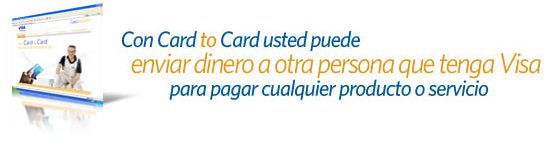 Card to Card es un servicio que permite enviar dinero con su tarjeta de Crédito Visa cuyos titulares sean personas físicas, a través de las tarjetas de crédito o recargables relacionadas a las mismas.