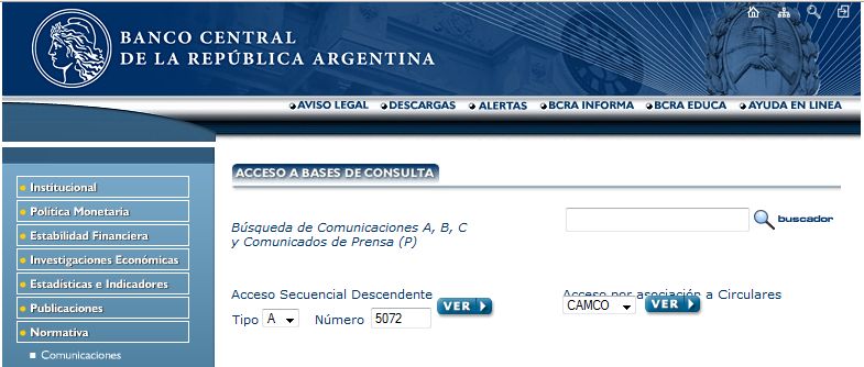 Para acceder a las bases de consultas de estas comunicaciones hay que ingresar al sitio del BCRA y del menú de la izquierda debe seleccionarse la opción "Normativa" y dentro de "Normativa" debe seleccionarse "Comunicaciones". Luego aparece el siguiente formulario donde hay que seleccionar el tipo de comunicación y el número: