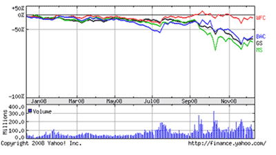Actualmente en Estados Unidos, el modelo de banco mayorista o investment bank, parece condenado a desaparecer. Luego de la caída de Bear Stearns y Lehman Brothers y la venta de Merril Lynch; Goldman Sachs (GS) y Morgan Stanley (MS) reconvirtieron su estatus de banco de inversión a banco comercial. El siguiente gráfico muestra (a través de la cotización de las acciones) la confirmación de las opiniones de mercado sobre este tema.