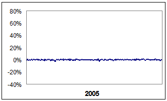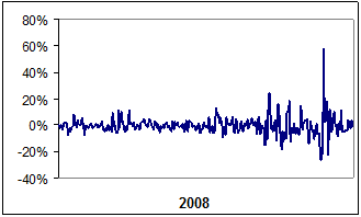 El primer gráfico muestra las oscilaciones en los retornos diarios de la acción de Citibank durante el año 2008 y el segundo el mismo dato en el año 2005. En el último año citado la volatilidad fue del 12.21% y los precios expresados en dólares tocaron un máximo de 49.78 y un mínimo de 43.05, sobre un valor promedio de 46.61. En 2008 el valor promedio fue de 19.04 y los máximos y mínimos de 29.69 y 3.77 respectivamente.