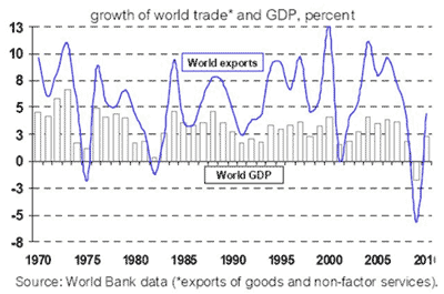 Continuando con la línea de análisis del artículo anterior, el gráfico a continuación (fuente: Banco Mundial) nos muestra lo que constituiría la primera caída en la producción mundial de la historia reciente, si se confirman las proyecciones para 2009. El nivel esperado de retroceso acorde a las últimas estimaciones representa un deterioro de 2.6 puntos respecto a las mismas proyecciones realizadas por el banco mundial en noviembre de 2008. En ese momento la expectativa era que en 2009 se registrara un crecimiento del 0.9% en la economía mundial. Los números actuales proyectan esa cifra en una caída del 1.7%.