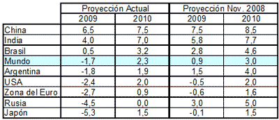 En la siguiente tabla se observan las proyecciones con mayor nivel de detalle para países seleccionados; ordenados de manera decreciente en función de los datos actualizados para 2009. Como tendencia general se aprecian las mayores caídas en los países de más desarrollo (con Rusia como excepción) y el ajuste a la baja generalizado.