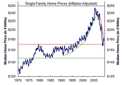 El gráfico (*) muestra la evolución del precio promedio en miles de dólares de una propiedad familiar, ajustado por inflación en los Estados Unidos, desde 1970 hasta la fecha. El escenario más probable desde 1990 era que la suba de las propiedades nunca se detendría. Esto posibilitó, entre otras cosas, que sobre una hipoteca vigente se volviera a otorgar crédito; sobre la base de la revalorización de la garantía.