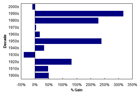 El siguiente gráfico(1), muestra que la década de 2000 ha sido la segunda en el siglo con rendimiento negativo; detrás de la de 1930.