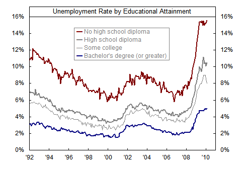 El departamento laboral del gobierno de los Estados Unidos ha reportado que el desempleo se alcanzó el 9.7% durante el mes de febrero. Como la mayoría de los indicadores, arroja un valor promedio para el total de la población analizada. El gráfico que presentamos a continuación(*) desagrega ese porcentaje promedio en función del nivel educacional. Se aprecia la dispersión existente, ya que mientras la parte de la población con menor nivel educativo roza el 16%, la de mayor nivel educativo apenas alcanzan el 5%.