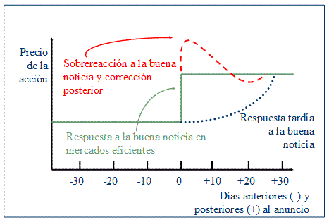El gráfico nos muestra en la línea verde cual sería el comportamiento de una acción ante una noticia favorable, bajo la hipótesis de mercados eficientes. La suba sería instantánea por lo cual prácticamente ningún operador podría sacar provecho de la misma. Sin embargo por la ineficiencia de los mercados puede existir una sobrereacción o una respuesta tardía que en el corto plazo volverá a ajustar al nivel de equilibrio. Esas fallas en la eficiencia son las que dan lugar a las ganancias o pérdidas en las transacciones de corto plazo.
