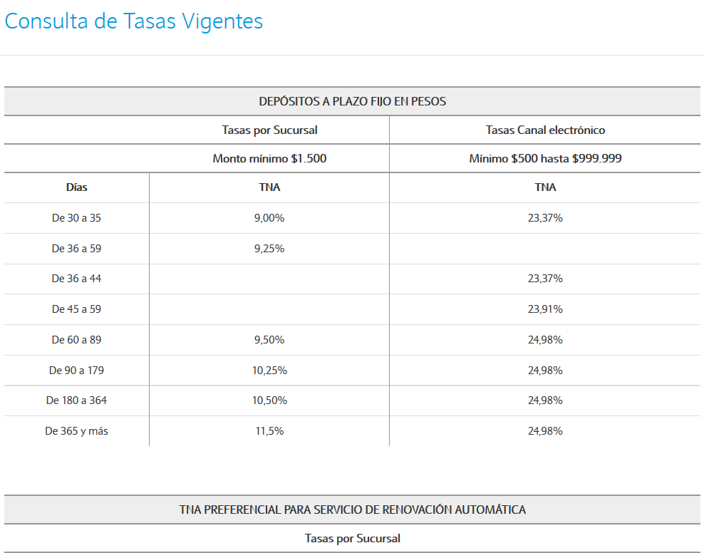 Tasas de plazos fijos Banco Nación (tasas por sucursal y tasas por canal electrónico):