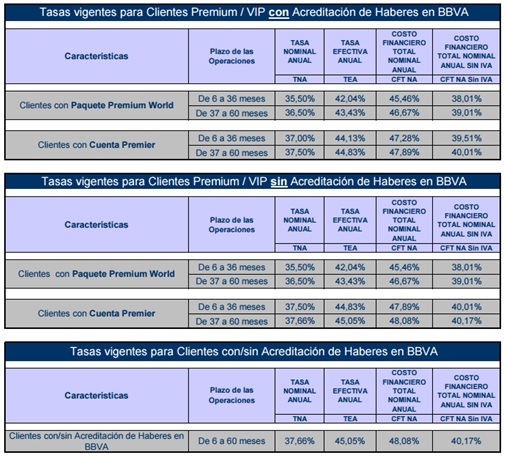 Si analizamos el caso de un préstamo personal para el mayor plazo de financiación 60 meses, obviamente que los clientes más beneficiados con las tasas y CFT más bajos son los que poseen el paquete de productos más Premium del BBVA (Paquete Premium World) y acreditan haberes en la entidad. En este caso, para 60 meses el CFT es de 46,67%. Aún, no acreditando haberes en el banco este tipo de clientes continúa accediendo a un préstamo personal con un CFT de 46,67%.