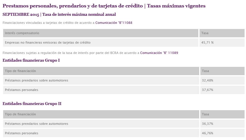 Cabe recordar que a través de la Comunicación “B” 11089, el BCRA regula y establece tasas de interés de referencia para el mes de septiembre de 2015 que deben ofrecer las entidades financieras para las distintas líneas de créditos, entre los que se encuentran los préstamos personales, y que se detallan a continuación: