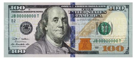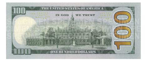 • El nuevo billete de US$100 El gobierno de los Estados Unidos rediseña la moneda estadounidense para anticiparse a las amenazas de falsificación. Los billetes con el diseño anterior seguirán siendo válidos Cuando se emita el nuevo billete de US$100 el 10 de febrero de 2011, no será necesario cambiar los billetes con el diseño anterior por los billetes nuevos. Toda la moneda de los EE.UU. seguirá constituyendo moneda legal, independientemente de cuándo fue emitida. • Las nuevas características de seguridad del nuevo billete rediseñado de US$100 Existen varias características de seguridad en este billete rediseñado de US$100, Banda de seguridad en 3-D: Busque la banda azul en el anverso del nuevo billete de US$100 con imágenes de campanas y números “100”. Incline el billete hacia arriba o hacia abajo fijando su atención en la banda. Campana en el tintero: Busque la imagen de una campana dentro de un tintero de color cobre en el anverso del nuevo billete de $100. Dependiendo del ángulo del billete, la imagen de las campanas cambia de color cobre a color verde, un efecto que hace parecer que la campana aparece y desaparece dentro del tintero.