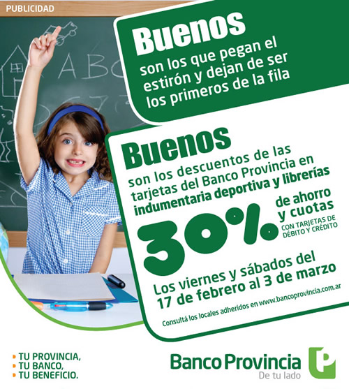 Hasta el 3 de Marzo el Banco Provincia te ofrece hasta 30% de descuento con sus tarjetas con motivo del comienzo de clases.