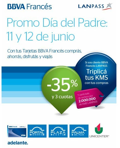 Este 11 y 12 de junio hacé todas tus compras del Día del Padre en Unicenter, Plaza Oeste, Palmas del Pilar y Portal Rosario porque con tus Tarjetas BBVA Francés disfrutás un 35% de descuento en los locales adheridos. Si sos cliente BBVA Francés LANPASS, tus compras suman el triple de KMS. y además participás por el sorteo de 2.000.000 de KMS. LANPASS para viajar a donde vos prefieras. Y si no tenés tu Tarjeta BBVA Francés LANPASS y vas a Unicenter, podés sacarla en las fechas de la promo en nuestro stand del 2do nivel.