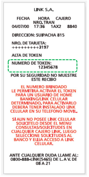 El Token permite llevar a cabo operaciones que actualmente te obligan a pasar por primera vez por un Cajero Automático (alta de cuentas nuevas para transferencias, alta de nuevos celulares para recarga y alta de tarjetas de crédito para pagos). Es decir, podés realizar estas operaciones de adhesión de forma más rápida y sencilla, sin necesidad de trasladarte a las sucursales. La utilización de este servicio es gratuito. Para utilizarlo debes ser usuario de Home Banking y tener descargada la aplicación Link Celular en su móvil.