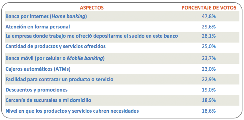 Otros aspectos relevantes para los encuestados a la hora de elegir el banco con el que operan son: la cantidad de productos y servicios ofrecidos, el servicio de banca móvil (Mobile banking), la calidad el servicio de cajeros automáticos (ATMs) y la facilidad para contratar un producto o servicio. En el siguiente cuadro se expone un detalle con los resultados de la encuesta en relación a este tema.