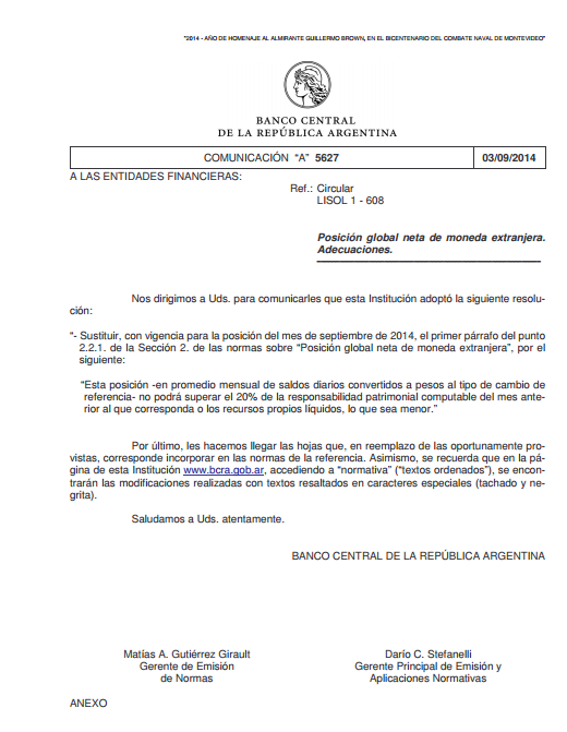 Por Com. “A” 5627 del 3/09/14 el BCRA limitó aún más los dólares que pueden tener los bancos, dado que a partir del mes de septiembre de 2014 la posición global neta en moneda extranjera cuando sea positiva (activos superiores a pasivos) no podrá superar el 20 % de la Responsabilidad Patrimonial Computable (la RPC es el patrimonio neto del banco más o menos algunos conceptos). El límite anterior era del 30 %, por lo que las entidades financieras deben deshacerse del 10 % de sus posiciones en moneda extranjera, que principalmente son dólares.