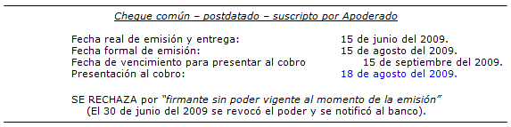 En este tipo de cheques, la fecha de emisión real y de entrega (15 de junio del 2009) no coincide con la fecha de emisión formal (15 de agosto del 2009), circunstancia ésta que torna altamente riesgosa la suerte de ese cheque para el portador, porque ninguna seguridad tiene acerca de que el firmante del mismo tuviese aptitud legal para emitirlo a la época de la fecha consignada en el título.