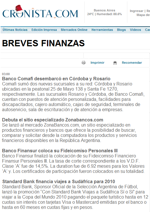 Se lanzó al mercado ZonaBancos.com, un sitio especializado en productos financieros y bancos que ofrece la posibilidad de buscar, comparar y solicitar desde la computadora los productos y servicios financieros disponibles en la República Argentina.
