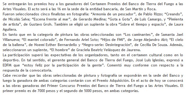 El Banco de Tierra del Fuego premiará hoy a los ganadores del Concurso Premios del Banco de Tierra del Fuego a las Artes Visuales. Las obras seleccionadas serán expuestas en la sede de San Martín y Roca.