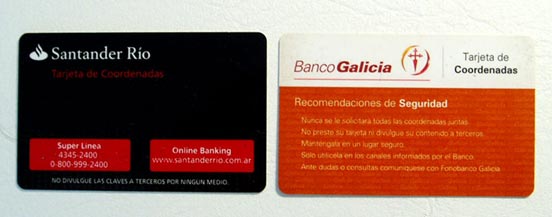 La Tarjeta de Coordenadas es una de las herramientas de seguridad por la que han optado varios de los principales bancos. Se trata de una tarjeta que contiene al dorso una grilla de coordenadas agrupadas por letras y números, de la cual se solicitan determinada combinación y que permite validar la identidad del usuario para poder acceder a operar. Si bien, la tarjeta es fácil de trasladar y muy simple de utilizar, nos podemos encontrar ante situaciones donde ponemos en riesgo su información sin darnos cuenta. Debemos evitar: