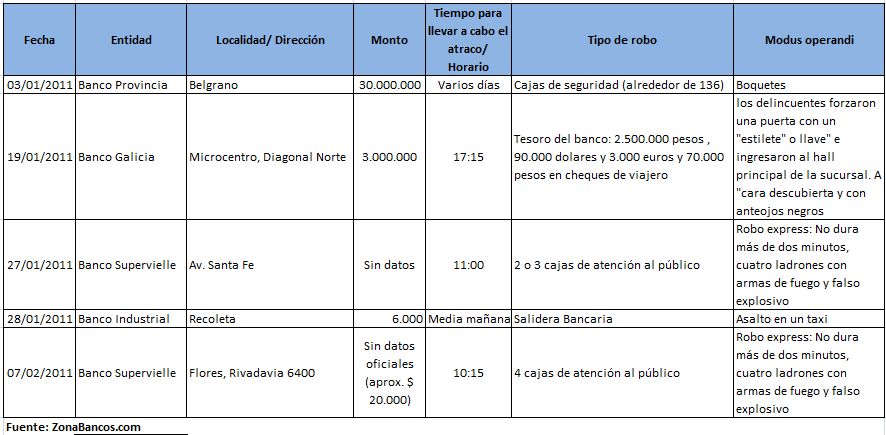 En el siguiente cuadro se expone cronólógicamente los robos acontecidos durante el mes de enero de 2011 y los primeros días de febrero con el detalle de la fecha del robo, entidad afectada, monto involucrado, tipo de robo (boquete, robo express,salidera bancaria, etc.) y modus operandi, entre otros.